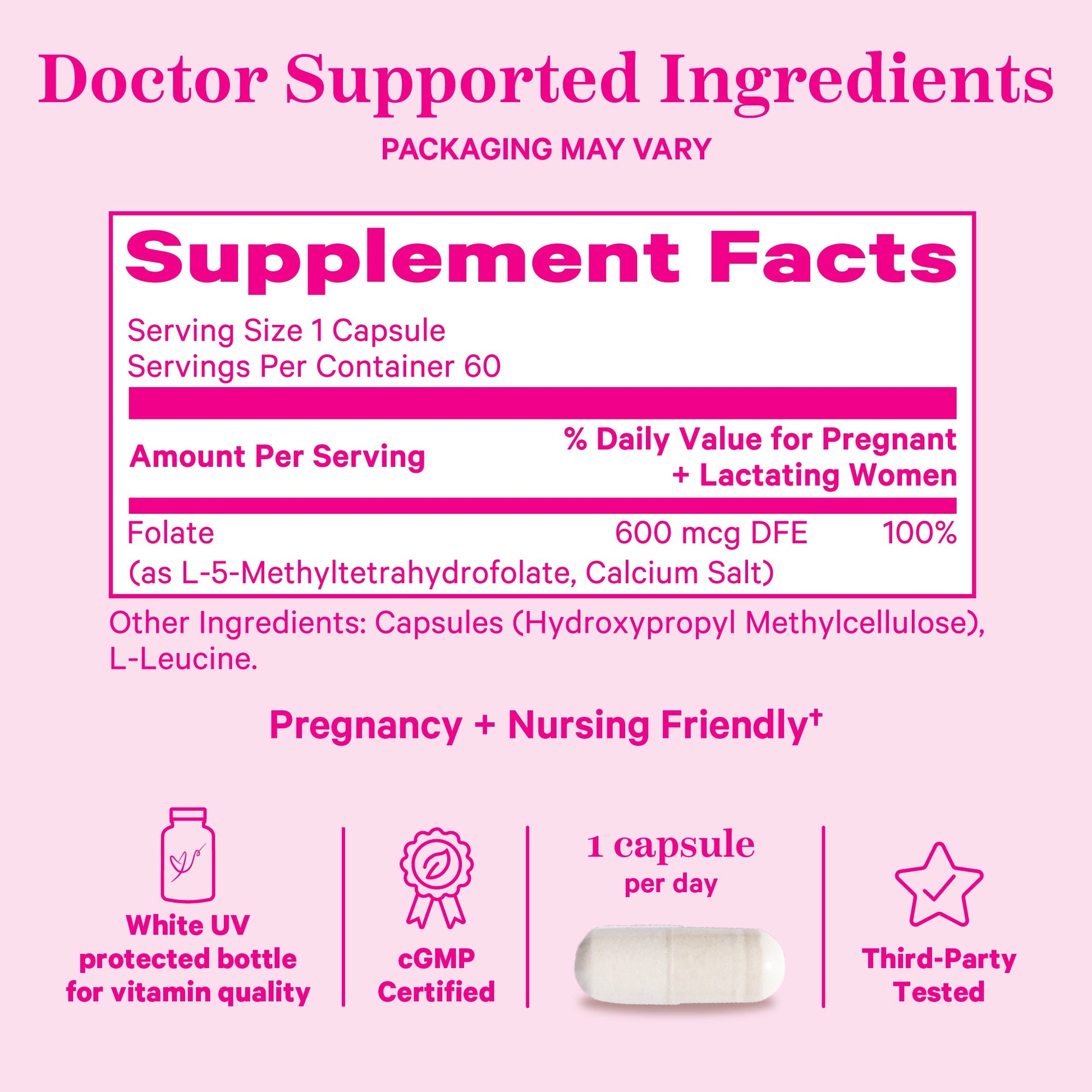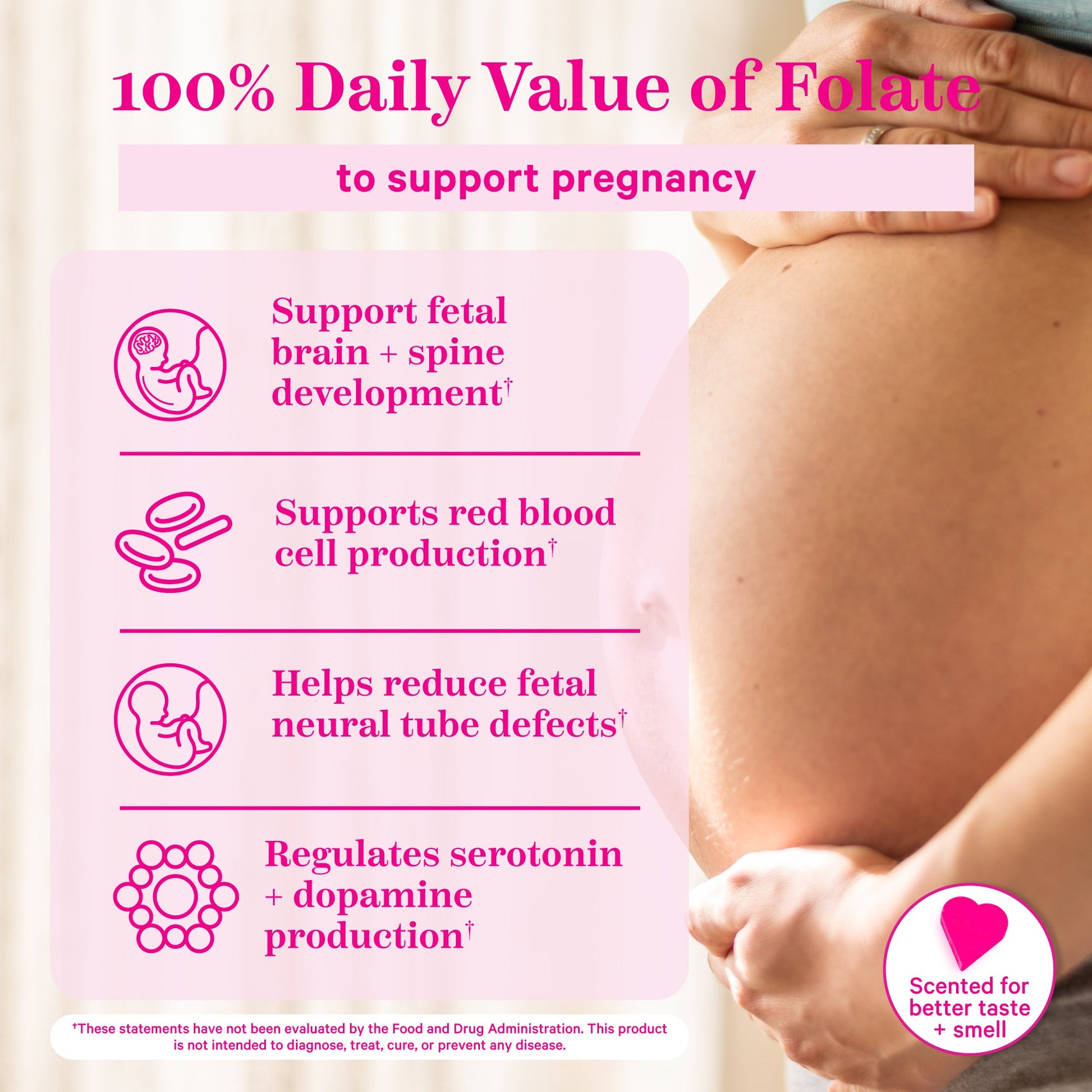 Pink Stork Folate provides 100% of the daily value of methylated folate, an essential nutrient for pregnant women. This bioactive form of folate is more easily absorbed by the body, making it a more effective choice than synthetic folic acid.