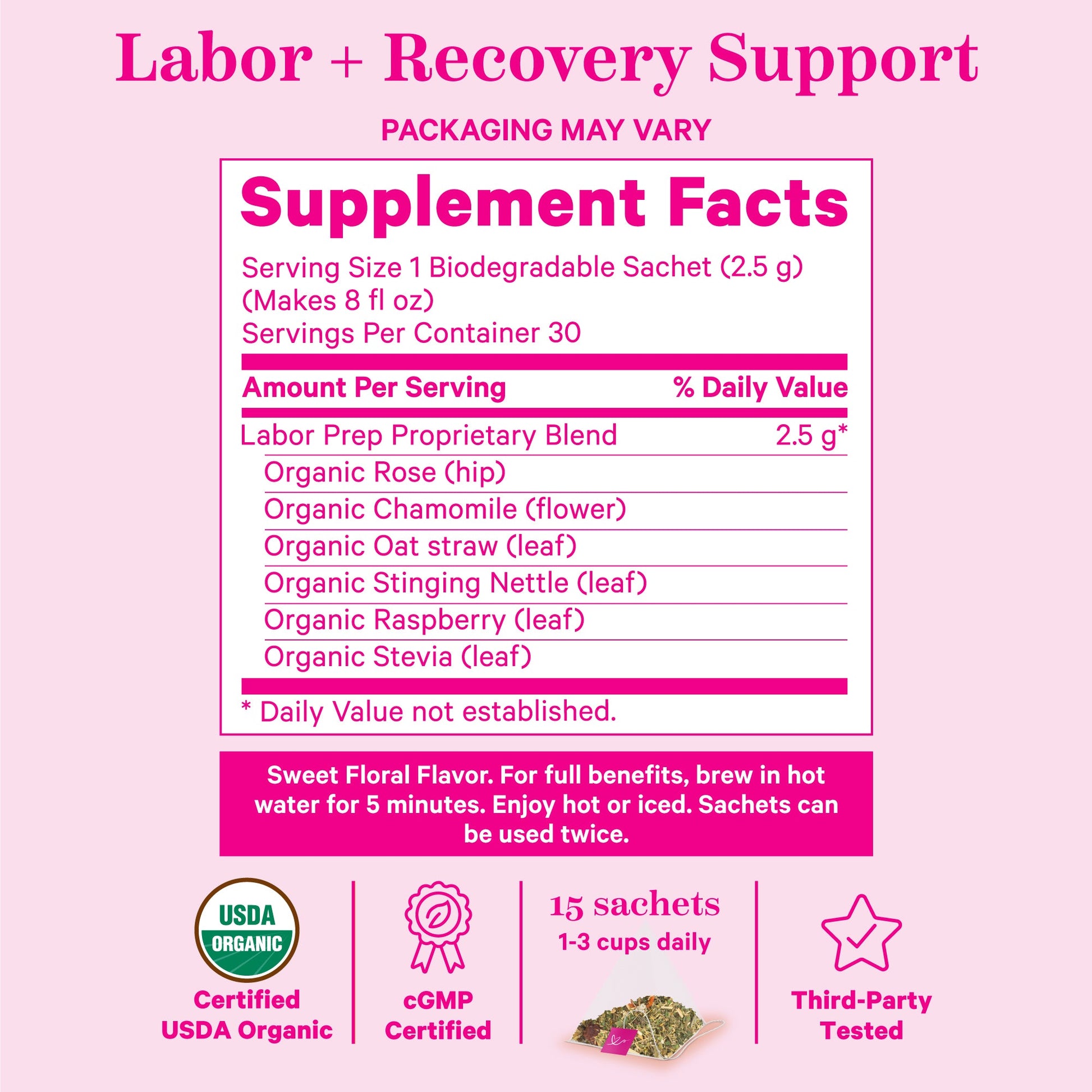 Pink Stork Labor Prep Tea features USDA organic Red Raspberry Leaf, Chamomile, Stinging Nettle, and more to help prepare body for labor, and support postpartum recovery.