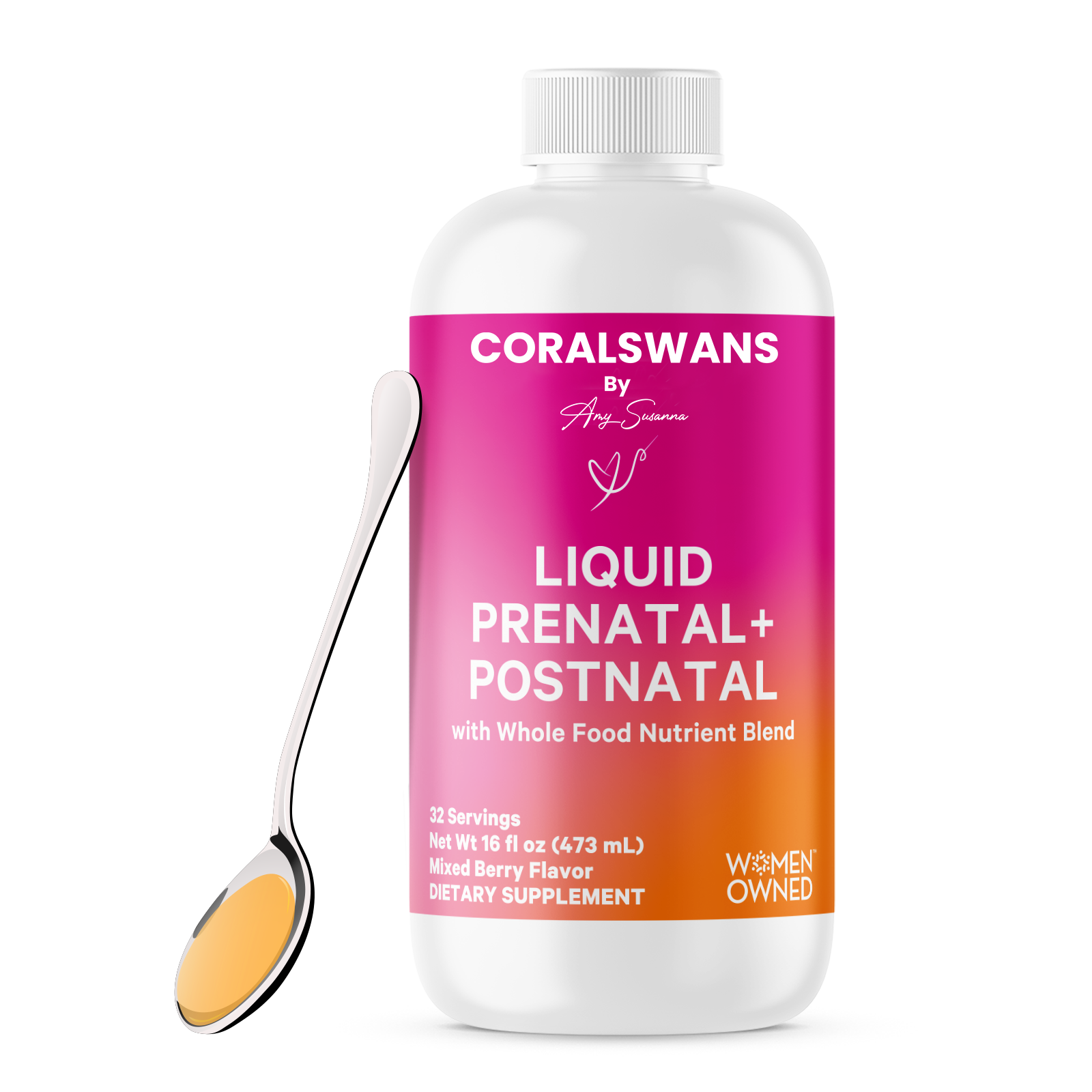 CoralSwans Liquid Prenatal + Postnatal is formulated with 100% of 16 vitamins recommended by OB GYNs, sourced from organic, whole-food blends, including elderberries, spinach, ginger, acerola cherries, kale, and other nutrient-rich ingredients.